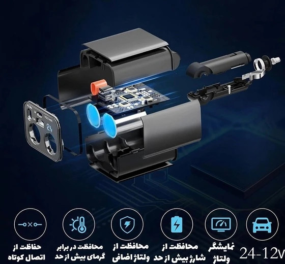 با داشتن دو خروجی فندکی اضافه، این شارژر میتواند بهصورت همزمان دستگاههای بیشتری را پشتیبانی کند. - تراشه هوشمند و شارژ ایمن